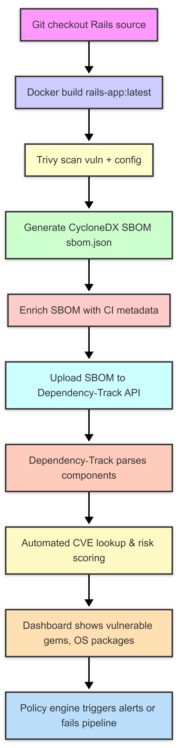 This pipeline demonstrates a repeatable, automated workflow that produces an SBOM for every container and IaC artifact, enriches it with metadata, pushes it to Dependency‑Track, and enforces a risk gate before allowing promotion.