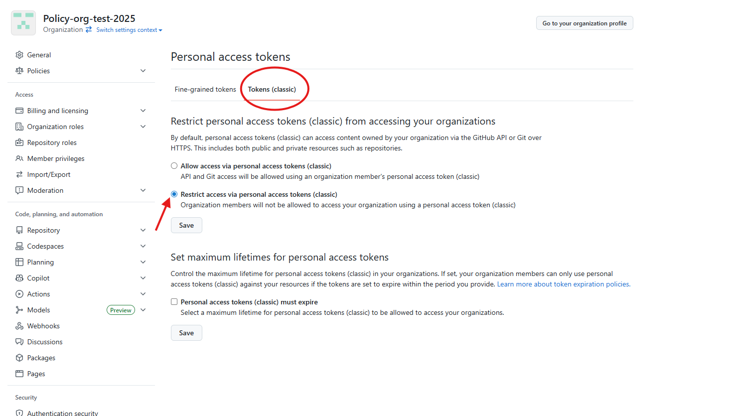 • Restrict Token Creation: Limit who can create PATs within the organization. Consider restricting creation to specific teams or administrators.
