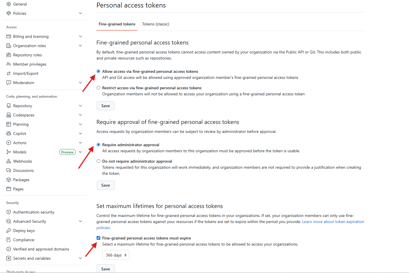 • Require FG-PATs: Enforce the use of Fine-Grained Personal Access Tokens instead of classic PATs.
