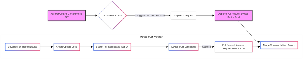 The “Device Trust Workflow” subgraph shows the intended secure path. Notice how the attacker completely circumvents this path by leveraging the PAT directly against the API.